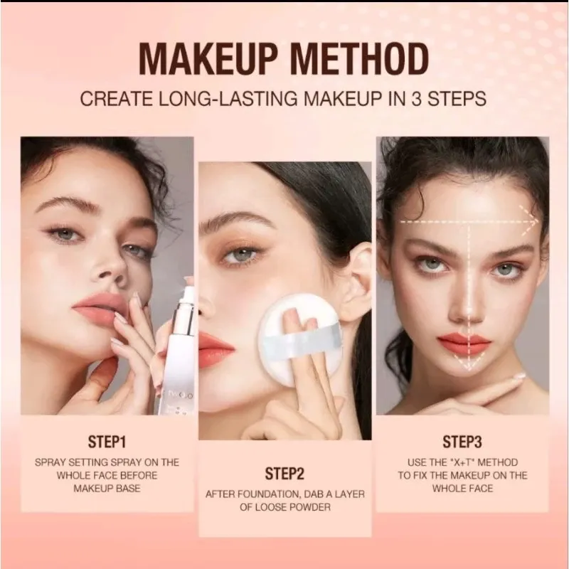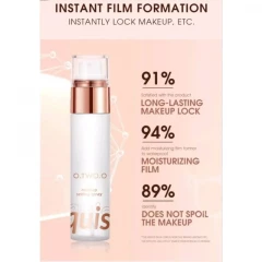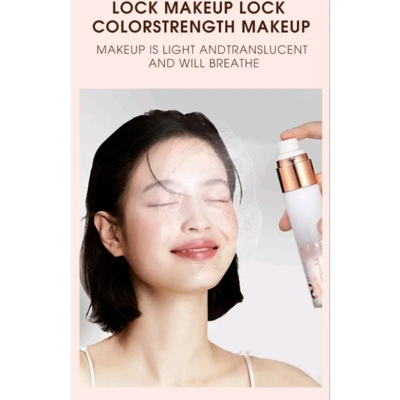 Clear to lock makeup with lasting effect. Fine mist with quick melting on skin; lightweight coverage to set makeup; quick-drying film to lock makeup base; full contact without powdery and taking-off, transparent effect without dullness.
